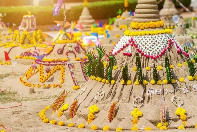 3、堆沙塔(ก่อพระเจดีย์ทราย):在寺庙用沙堆塔,插彩旗鲜花,象征补足一年中带走的沙土,积累功德。