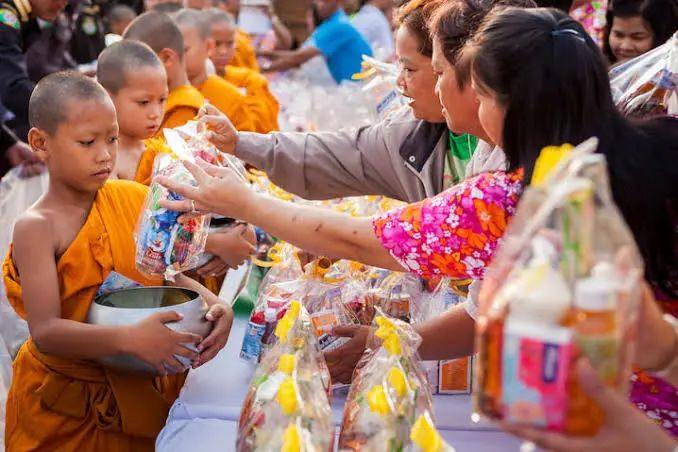 4、寺庙布施:清晨向僧侣供奉食物,参与诵经祈福。